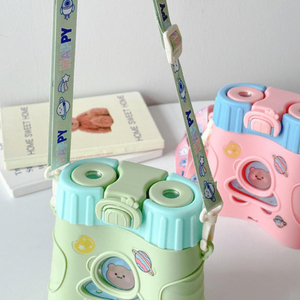 Supply Smiles Cartoon Space Water Bottle with Straw & Strap | Cute Bear Design Portable Kids Bottle (Pink & Green)